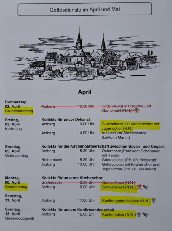 - der Gottesdienst an Ostermontag in Arzberg um 10:00 Uhr (mit Posaunenchor) feiert mit Ihnen Lektor Christian Hinz, das Abendmahl muss aber leider entfallen. Der Gottesdienst in Grafenreuth muss leider ebenfalls entfallen