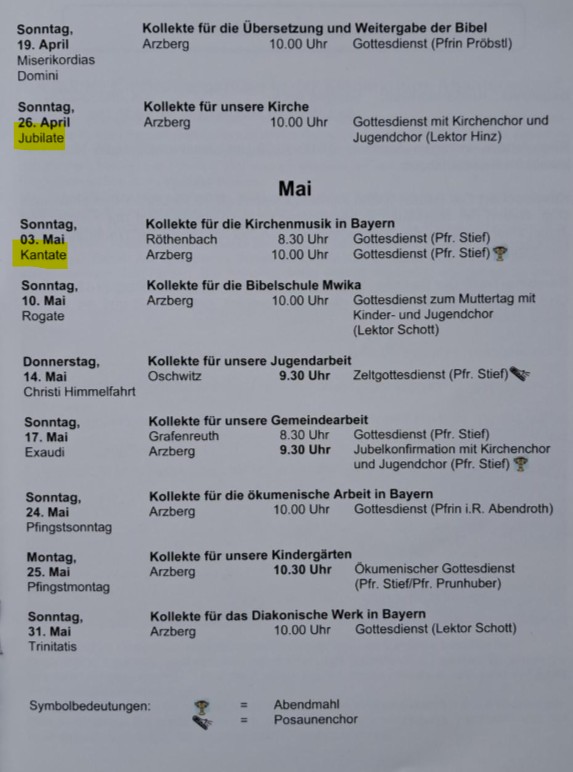 zusätzlicher Hinweis zu einem Druckfehler: Die Gottesdienste zu Jubilate und Kantate wurden getauscht: